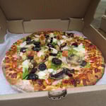 Pepperoni, ham, onion, green pepper, jalapeños, black olives, tomato, pineapple, mushroom
